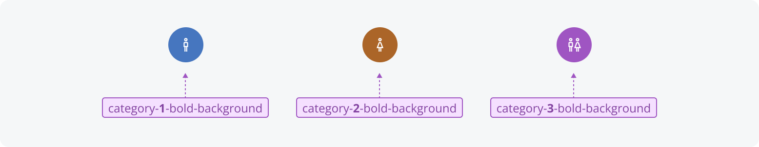 Category provides a set of 20 numbered groups. These groups don't have predefined meanings, so you can assign significance locally, such as for tagging content or organizing data visualizations. Each category is represented by a number to avoid implying any system-level meaning or color, since colors may change across themes and modes.