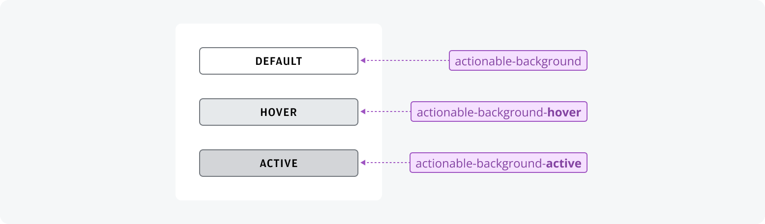 State refers to the condition of a design attribute, such as hover, disabled, active, selected or read-only. If no state is specified, it is considered the ‘default’ value.